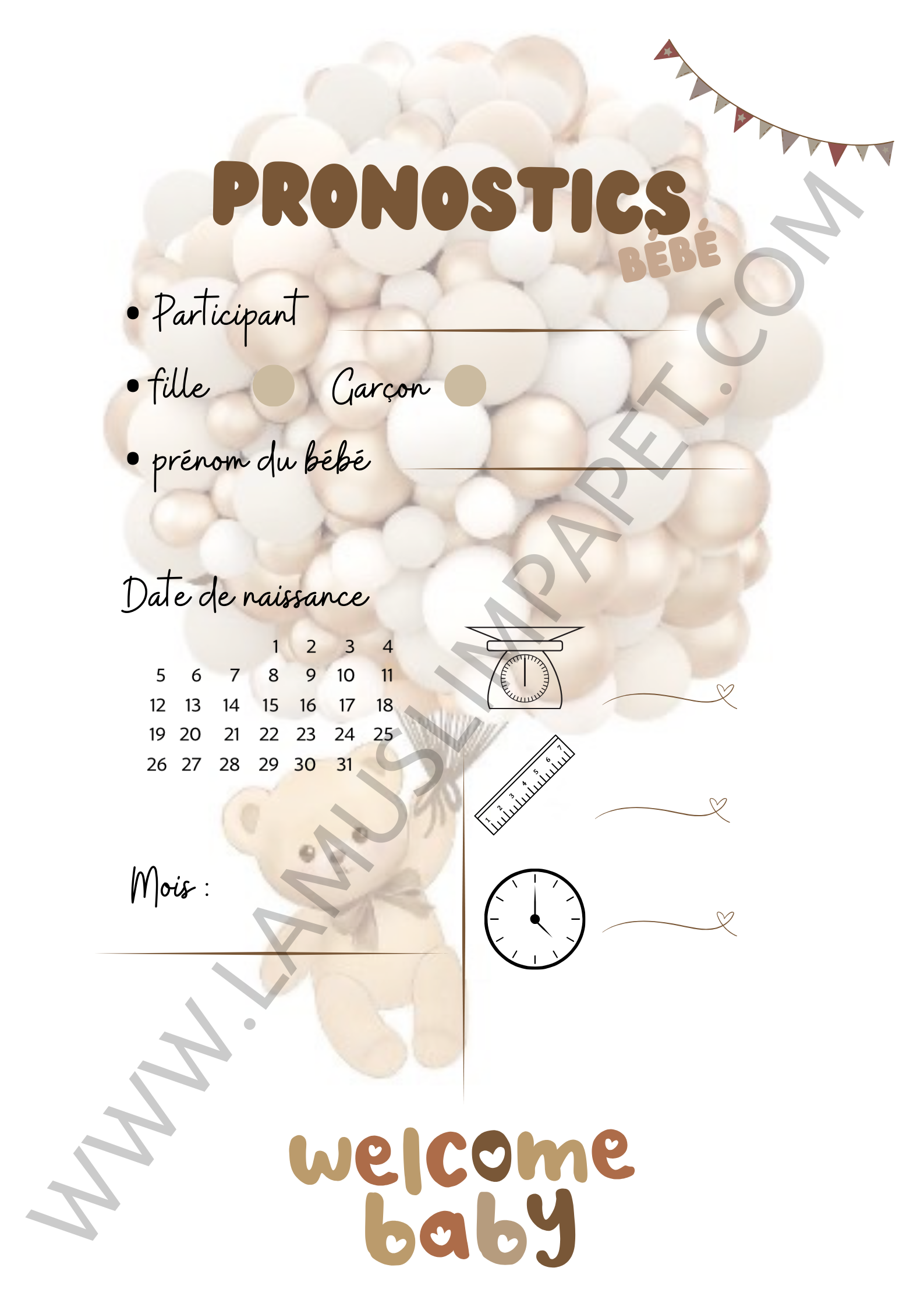 Cartes pronostics naissance modèle Ours et ballons | Baby Shower ( à télécharger )